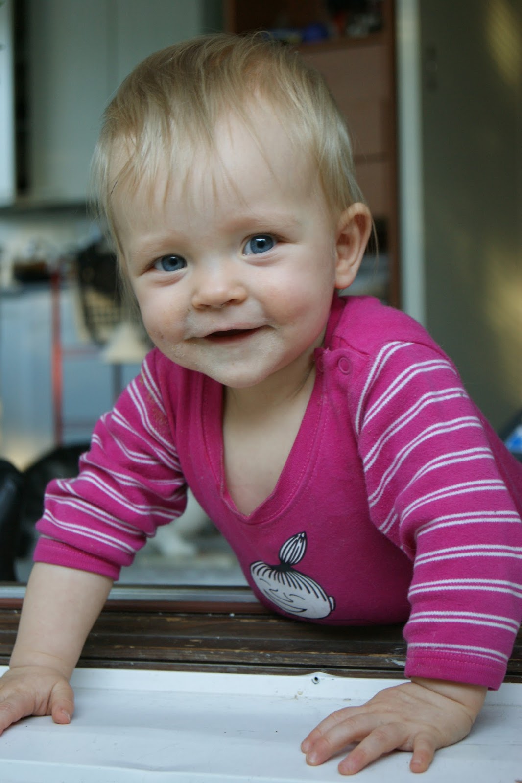 Kotona Maria oli oma ittensä, seisoskeli tv-tasoa vasten ja hihitteli. Tosin itkuherkkä oli pitkästä aikaa, ettei vaan hampaita pukkaa, kun kuolaa vuotaa suusta kuin vettä putouksesta!