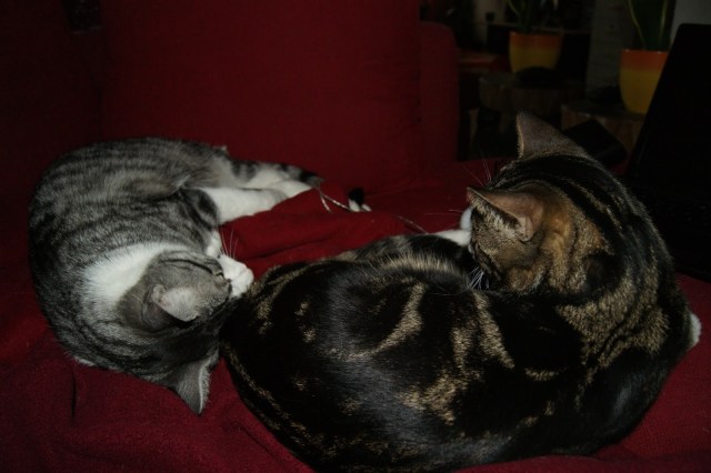 Lumo on tullut selvästi emoonsa, kasvattaja kertoi että äitiliini oli juuri sellainen, mikä meidän pojasta on kasvanut. Tulee hakemaan huomiota silloin, kun sitä haluaa ja ottaa sitä sen verran kun haluaa. Muuten ei passaa mennä sohimaan. Maria kyllä tuntuu saavan tehdä mitä tahansa, ei kiinnosta. Lumo on ottanut Marian omaksi suojatikseen, jota pitää varjella pahalta Vililtä ja Nöpöltä. Hassu kissa. 🙂