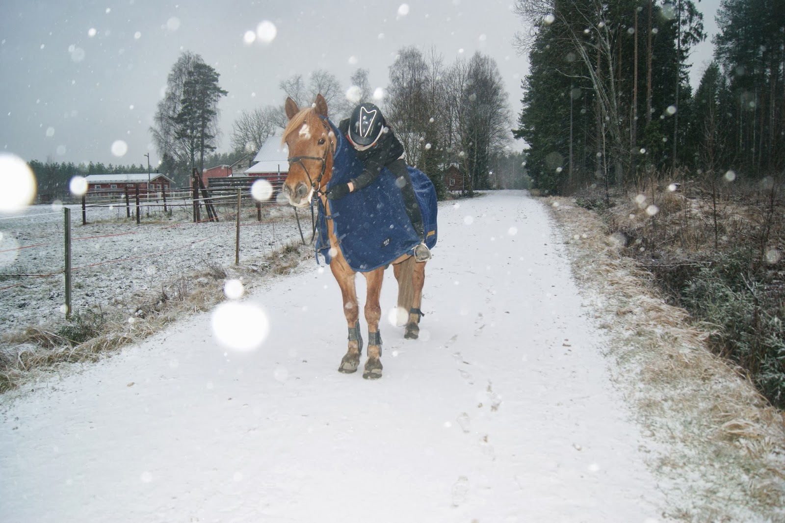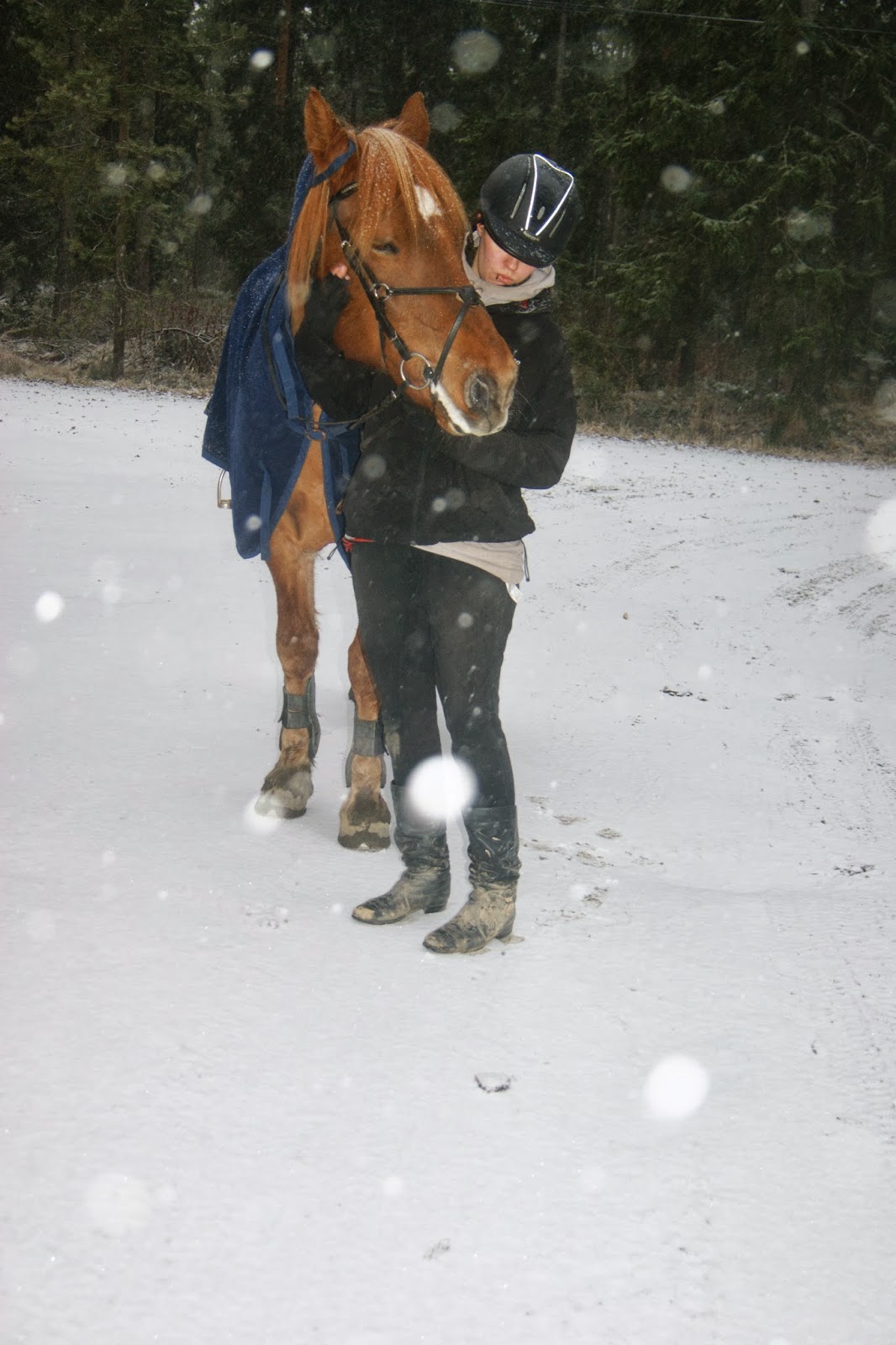 Loppukäynnit ennen talliin menoa tehtiin maastossa. Lunta oli tullut vajaan pari tuntisen maneesissa olon aikana aika sopivasti, ja lisää vaan tuli joten siinä sitten ihmeteltiin Topin kanssa että mites nyt, kun kaikki näytti niin oudolta. Onneksi herra ei turhista säpsyile, joten lähdettiin sitten vähän köpöttelemään. 🙂