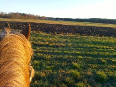 Takaisin päin kun lähdettiin kipittelemään, olisi vauhtihaluja ollut mutta paha täti ei antanut. Keräsin vaan ohjia ja aloin kokoamaan Topia pikkuhiljaa enemmän ja enemmän, mutta kummiskin säilyttäen reippaan ja ennen kaikkea rennon kulkemisen. Ravipätkässä hain kevyen ja rennon kulkemisen, ja suhteellisen matalaa muotoa jotta selkä olisi mahdollisimman paljon mukana.