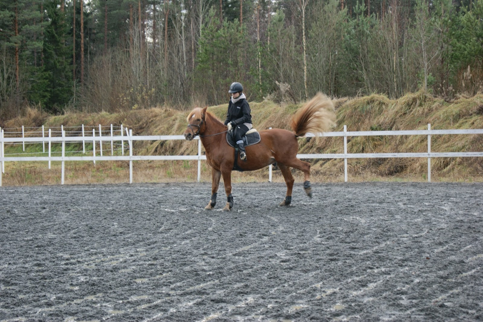 Heti alkukäynneistä saakka oli Topin kanssa järkyttävä tappelu kun ei olla pitkään aikaan ulkona menty, ainoastaan maastoiltu jos ei olla maneesilla oltu. Ja sen kyllä huomasi. Kyttäili joka nurkkaa, eikä meinannut kuunnella yhtään. Painoi kuolaimelle niin käynnissä kuin ravissa, kipitti ja vöyhkäsi. Aikani kun Topin kanssa tappelin, että saisin sen kuulolle ja liikkumaan puhtaasti ravissa, alkoi myös herra toimimaan hyvin. Paljon ympyröitä, välillä kenttä ympäri ja siitä sitten sai jonkin ihmeellisen kaahotus-pakkomielteen päälle.