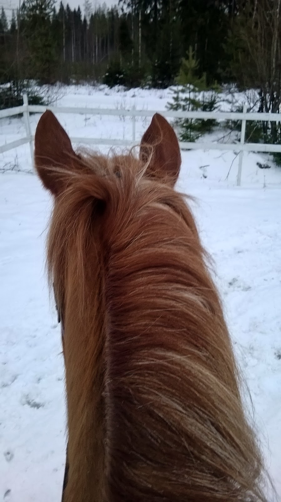 Niinkuin otsikko kertookin, Topilla oli vasemman puolen kintuista kengät ottaneet hatkat. Se siitä maastoilupäivästä sitten. Jäin sitten kentälle pyörimään, mutta eipä siitäkään mitään meinannut tulla, kun Topi arkoi pohjaa sen verran ja kengällisiin kinttuihin kasaantui kauheat lumipaakut. PLÄÄH! Se tarkotti sitten mukavaa käyntireeniä väistöillä sekä parit ravinnostot. Kyllä olisi jätkällä ollut menohaluja, mutta eipä se meinannut tasaisesti mennä laisinkaan, joten mentiin vain sen verran, että kulki tasaisesti eikä painanut kuolaimelle.