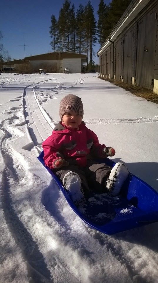 Onneksi olen niin laiska raijaamaan autosta turhat tavarat pois, niin alkuvuodesta lähtien on ollut pulkka takakontissa, niin kävin sen nappaamassa ja Maria kyytiin. Eipä ollut kiukkunen likka enään. 😉 Törmättiin myös Nikon veljiin ja toisen veljeksen koiriin ja Mariahan innostui! Pojulle ja Harmikselle koko ajan haukkui omalla tavallaan ja halusi kovasti rapsuttaa. 🙂 Piti myös päästä näyttämään, miten hienosti iso tyttö jo osaa kävellä kengillä ulkona ja oli niin onnellinen tyttö kun sai kovasti kehuja.