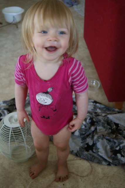 Tänään aamulla Marian mielestä Nöpö ei tarvinnut ruokaa, joten oli kaatanut nappulat pitkin keittiötä ja ottanut ruokakupin omiin leikkeihinsä. Vissiin vedetkin oli saanut kupista lentoa. Ja kaikki tämä ehtii tapahtua jo sillä välin, kun kaadat maitoa tuttipulloon! Siis 10 sek selkä Mariaan päin, niin ydinsota on valmis!