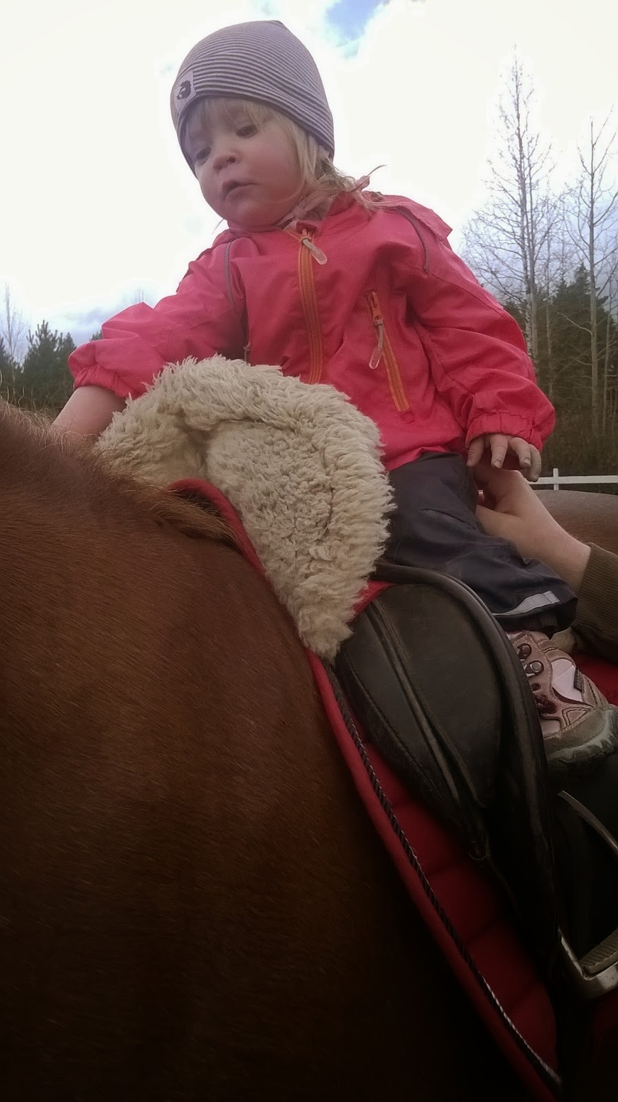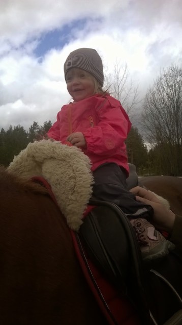 Aamulla ulkoiltiin ja tultiin sisälle vain syömään ja sitten heti lähdettiinkin liikenteeseen. Alkuun käytiin tallilla, kun kävin Topin juoksuttamassa satulan kanssa. Maria pääsi käymään selässä, ja voi kun tyttö oli niin onnellinen! Hienosti taputti ja oli muutenkin oikein mallikkaasti selässä! Topikin osasi käyttäytyä, niinkuin aina Marian ollessa tallilla mukana. 🙂