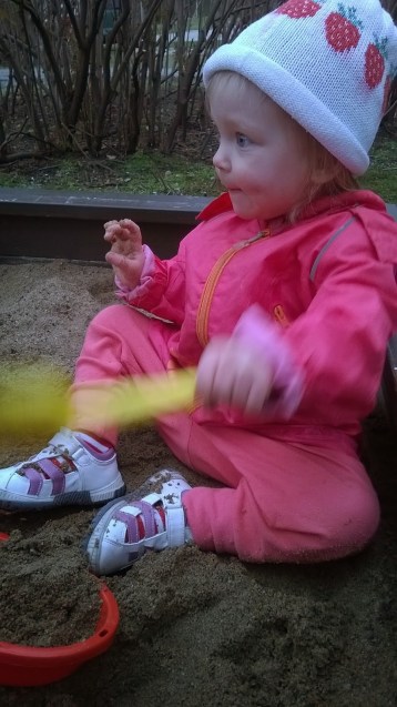 Hiekkalaatikolla viihtyi hiekkakakkujen parissa ensimmäistä kertaa kunnolla! 😀 Istui kuin tatti metsässä ja lapioi hiekkaa millon ämpäriin ja laivaan jne. Ei ole koskaan ennen meidän nähden heitellyt hiekkaa lapiolla, ja oli kiva nähdä taas uusi kehitysaskel! 🙂 Kovasti sanojakin toisteli, uusina sanoina on nyt koti ja kakku. Kysyin Marialta, että lähdetäänkö kotiin, niin sain vastaukseksi ”joo, kotiin” ja lähti kävelemään mummolan ovelle. 😀 On se hassu tyttö! ♥