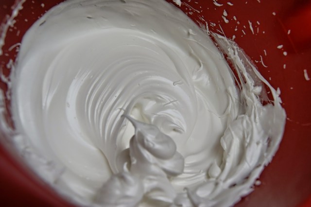 Kakku oli todella helppo tehdä, vaikka oli monta erilaista työvaihetta. Löysin koko ohjeesta vain yhden kriittisen kohdan, joka kotileipureiden tulee huomioida. Otin kuvan työvaiheesta valmiina, jotta näkee siitä miltä pitää näyttää. Heh, kuinka moni on vaahdottanut valkuaisia sähkövatkaimella niin, että kuppi ylös alaisin? 😀