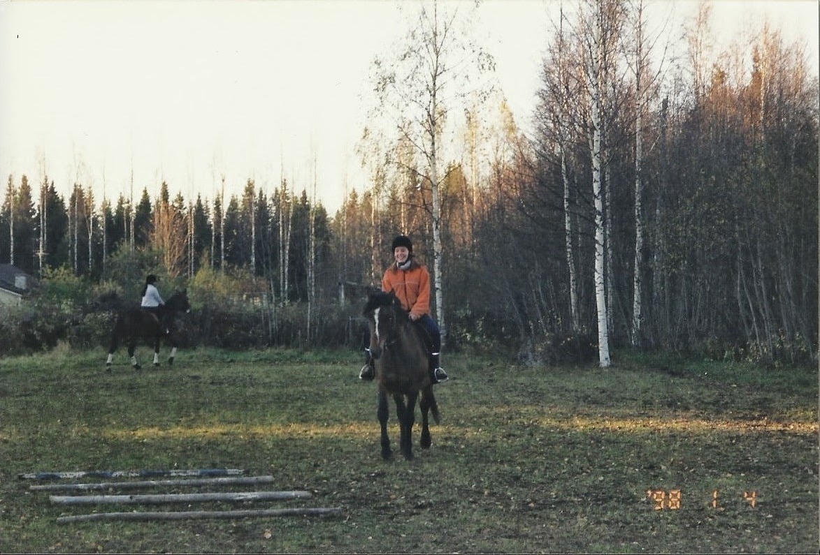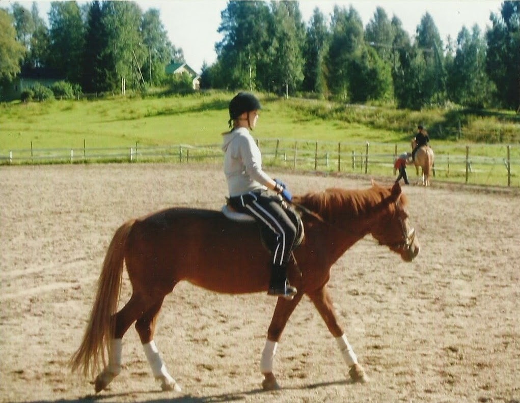 Saman vuoden syyslomalla lähdettiin H:n ja hänen siskopuolensa kanssa Vanajalle ratsastusleirille viikoksi kokeilemaan, miltä hevosen selässä tuntuisi tauon jälkeen olla. Siellä mulla oli hoitoponina Alica-niminen tamma, joka oli muuten hemmetin itsepäinen. 😀 Alican kanssa hypättiin elämäni ensimmäiset kunnon esteet ja maastoiltiin pitkin viikkoa. Ei ne maastoilut aina putkeen mennyt, kun Alica nousi kiitolaukasta pystyyn auton tullessa vastaan ja toisella kerralla tamma päätti mennä pupertamaan ojaan puista lehtiä, jolloin pyörähdin selästä sinne pohjalle, missä vettä oli ihan mukavasti. Hengissä selvittiin ja meno jatkui tallille.