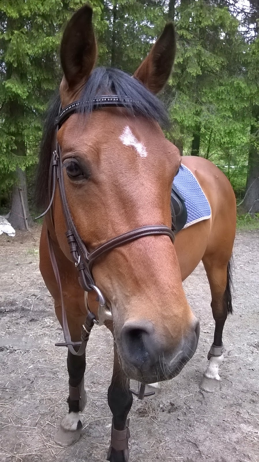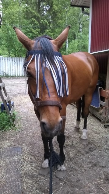 Mikkihän ei ole lapsi, mutta lapsen kengissä. Keksii joka päivä jotain, mikä on ihan ylitsepääsemätöntä. Eilen se oli esimerkiksi etusuojien laitto, tänään satula ja sunnuntainahan ei meinattu saada suitsia päähän kun ei suostunut kuolainta ottamaan vaan sen takia, että uusi ihminen piti testata. 😀