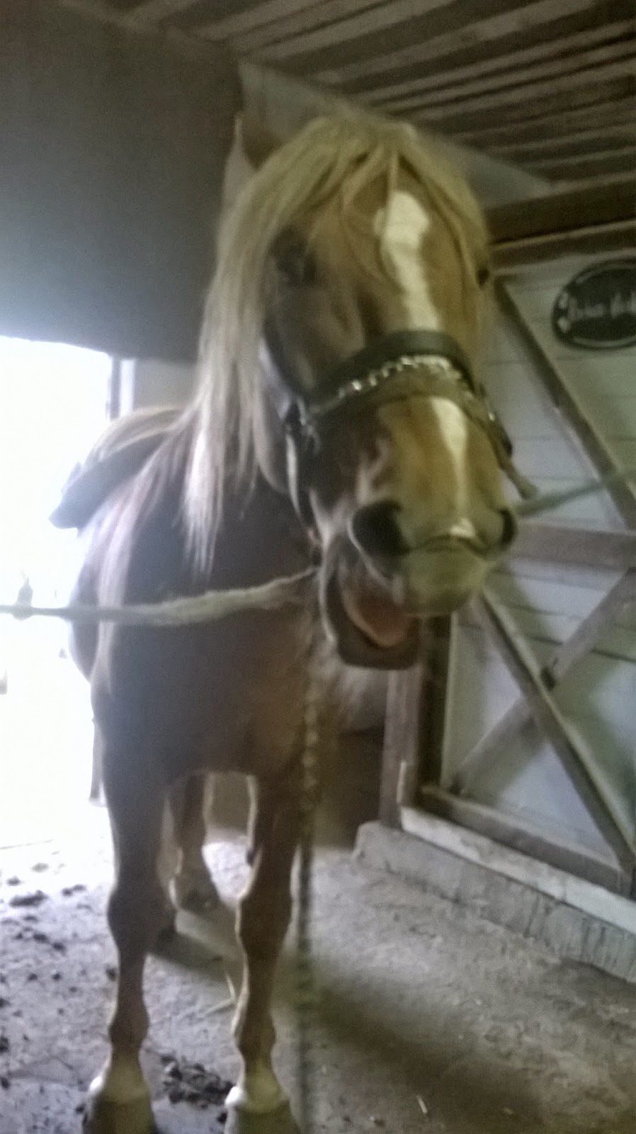 Myös ollut ihan ”luottamus” tehtäviä, nimittäin tammalaitumella on eräs tamma, joka vihaa pomoani. Ei suostu tulemaan portille, jos näkee valmentajan narun kanssa, mutta tänään tuli mun luokse ilman mitään ongelmaa. Ensimmäisellä kerralla tyttönen vähän epäröi, kun outo ihminen tulee hakemaan, mutta tänään (toinen kerta) tuli jo ihan omasta tahdostaan, kun nimeltä huutelin. Pomo nyt sitten päätti, että jos tammuskasta tule juoksijaa, niin sitten se tulee mulle ratsuksi. Jos joku sen sitten vain ensin kouluttaa, mä en siihen hommaan nimittäin lähde, vaikka symppisluonne neitosella onkin. 🙂