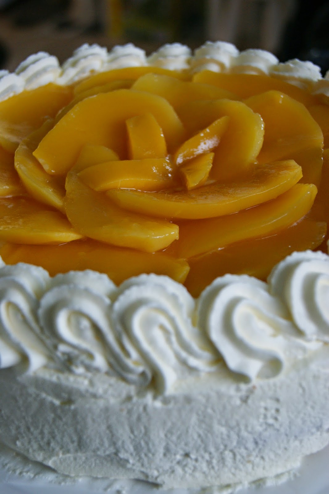 | Mangokermakakku, välissä mangorahkaa sekä päällä mangosiivuja |