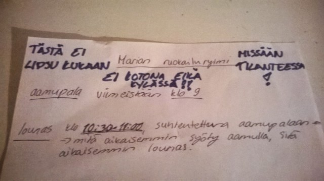 Joten, kun olin pahimman kuohunnan saanut laskettua kuunneltuamme tätä kinaamista koko päivän, tein kotiin meille ”pienen” tervehdyksen ja aikataulumuistutuksen, mitenkäs ne ruokailut menikään. Kyseinen lappu täytyisi viedä kyllä anoppilaan, siellä Maria napostelee kaksin käsin ja jaloin, eikä anoppi kuuntele sanaakaan ruoka-ajoista (taitaa olla tuntematon käsite ehkä?).