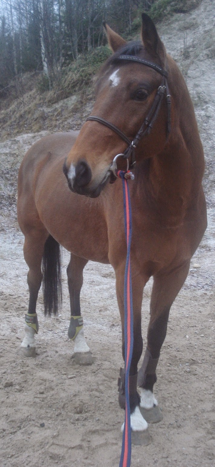 Tänään kävin aamutallin jälkeen moikkaamassa Mikkiä. Tarkoitus oli juoksuttaa ja vähän matkaa videoida sitä liinassa riekkumista, mutta pohjat oli niin älyttömän kovia, myöskin hiekkamontuilla, joten päädyttiin sitten treenaamaan luottamusjuttuja ja vähän kuvailtiin. Peruuttamista pyynnöstä, väistämistä jne. Kovasti olisi pöljäilyttänyt Mikkiä, kun oli jotain autonromuja (punaisia sellaisia..) pusikon takana, niin meni välillä ihan pörhistelyksi. 😀