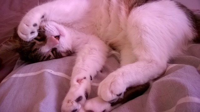 Mitä lähemmäksi mennään laskettua aikaa, sitä levottomammaksi muuttuu Nöpö. Jatkuva mamin rauhoittelu käynnissä kehräämisellä, turkin tempasi taas mitä parhaimmaksi silkiksi ja etutassut lyövät melkein tulta ja tappuraa, kun niin kova leipominen käy. Ja ei tule herralla kuuloonkaan, että suostuisi tulemaan mahan päälle ilman isoa kasaa peittoa meidän välissä. Luuleekohan tuo palikka-aivo, että se tenava syntyy ennenaikaisesti vaan sen takia, että istuttaisi karvaisen pyllynsä siihen ja aloittaisi maitobaarin aukaisulla? (kyllä, rinnat vuotaa kuin Niagaran putoukset) Ei se Mariakaan Nöpön rakkauden määrän vuoksi viikkoa aikaisemmin syntynyt, mutta annetaan hänen ylhäisyytensä niin luulla. 😉