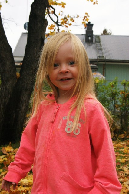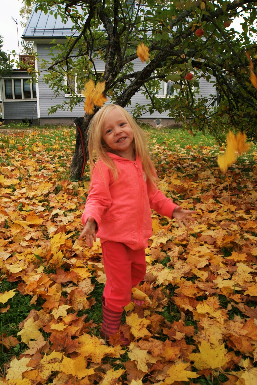 Vähän extempore-meiningillä mentiin kuvailemaan Marian kanssa pihalle, vaikka todella kylmä tuuli meitä häiritsi aivan liikaa, mutta eihän se meidän menoa haitannut. Maria rakastaa heitellä ruohoa, lehtiä ja kaikkea muutakin, joten ei paljoa tarvinnut houkutella ja hymykin tulee ihan luonnostaan. ♥