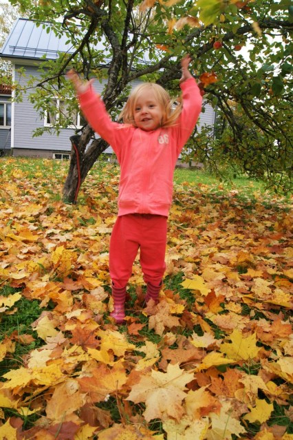 Onni on omassa pihassa kolme vaahteraa. Syksy värjää normaalisti suhteellisen tylsän puun suureksi värejä pihaan tuovaksi massiiviseksi puuksi joka myös pudottaa kolmevuotiaalle samalla mieluista tekemistä – saattaahan ne myös lievästi äidinkin villiinnyttää. 😉