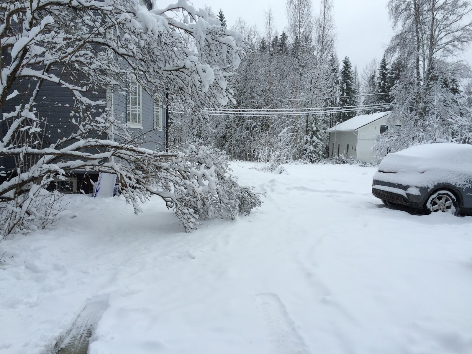 Onneksi eilen satoi sitten koko kuukauden edestä lunta! Piha piti jo eilen kolata ensimmäisen kerran ja yön aikana sitä oli tullut niin paljon, että meidän pihassa olevan puun pari isoa ja paksuhkoa oksaa oli katkennut juuresta saakka, kun ei ollut kestänyt lumen painoa. Pitää alkaa jo harkitsemaan lumien pudottamisia, kun katolle päässyt sitäkin kertymään.