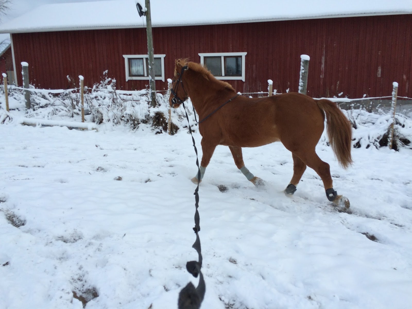 Ei mennyt tämän päiväinen ihan suunnitellusti. Alunperin piti mennä maastoon, mutta tiet oli aivan peilijäässä, joten varasuunnitelma oli mennä ilman satulaa – no enhän mä sinne selkään sitten taipunut tarpeeksi. Olin varuilta ottanut liinan mukaan lähinnä varuiksi, jos herralta löytyisi pöllöenergiaa niin olisi kevyellä alkujuoksutuksella saanut niitä karsittua poies. Hain tallilta sitten satulan, jotta olisi vähän helpompaa mennä, mutta kentän kunto.. Märkää hiekkaa paakkuuntuvan lumen alla ei ollut mikään parhain mahdollinen yhdistelmä. Pohja petti herkästi Ressun töpöjen alla ja kauhean kokoiset lumipaakut tilsaantui kavioihin jolloin alkoi myös askellus muuttua varovaiseksi ja kerran jopa meinattiin turvalleen lentää yhdessä.