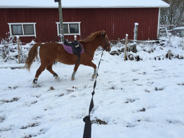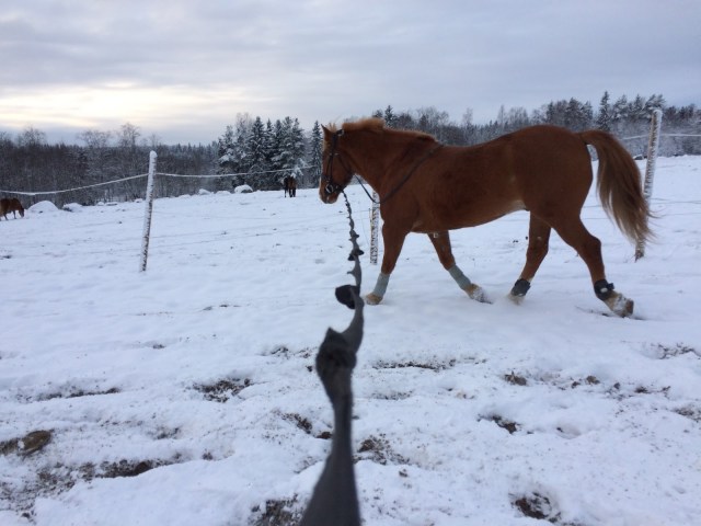Koska en halua olla julma, niin tulin suosiolla selästä alas ja laitoin Ressun liinan päähän jatkamaan liikkumista, kun selvästi niin kulki paremmin vaikkei kauhean mielellään etenkään käynnissä. Ravissa tilsaantuneet lumet irtosivat, joten vauhtia oli välillä liikaakin mutta tulipahan pojan liikuttua!