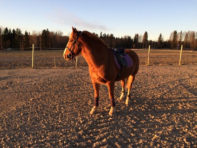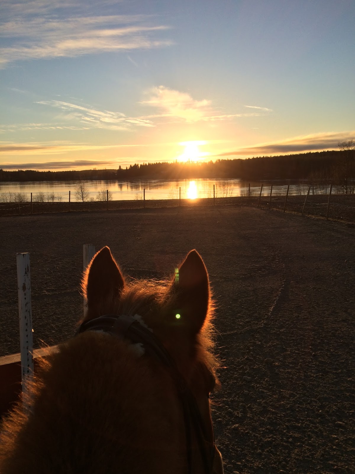 Jouluviikolla kävin vain kerran Ressun liikuttamassa, kun en yksinkertaisesti ehtinyt. Tänään otin sitten extrapäivän ja oli kyllä aivan mahtava ilma! Auringonlaskun alku, pieni kipakka pakkanen ja pieni tuuli. Kenttäkin oli juuri lanattu, joten pystyi kerrankin menemään suhteellisen normaalisti, laukkoja en ottanut kuin parit pitkät sivut, muuten käynti- ja ravipainotteisesti mentiin tänään.