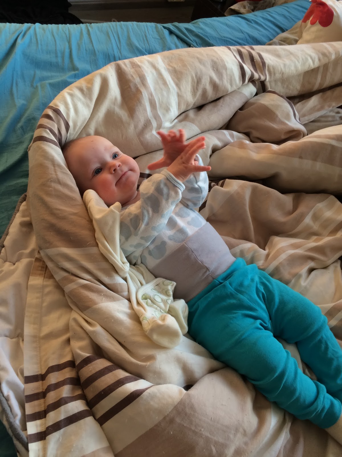 Neuvolassa sitten puhuin tästä, ja terkka sanoi että puolivuotiaat voivat jokeltelun yhteydessä tavutella, jolloin esimerkiksi sana äiti saattaa kuulua, mutta ei vielä sinällään tarkoita mitään. Lasta tietenkin olisi hyvä kehua kaikesta oikeaan taittuvasta sanailusta. Terkkari myös sanoi, että on hyvin mahdollista että Mia oppii suht nopeasti puhumaan, kun tykkää jo nyt jokeltaa niin paljon ja ”keskustelevat” Marian kanssa todella paljon.