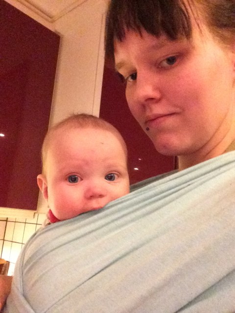 Nyt on alettu myös hampaita itkemään oikein urakalla. Johan Mia on kuolannut viimeiset 3 kuukautta kuin Niagaran putous ja lauantaina kipu vei likalta ruokahalun ja unet kokonaan. Ainut paikka missä viihtyi särkylääkkeen annon jälkeen oli liinassa. Liinan reunaa pureskeli aikansa kunnes nukahti ja nukkui melkein tunnin.
