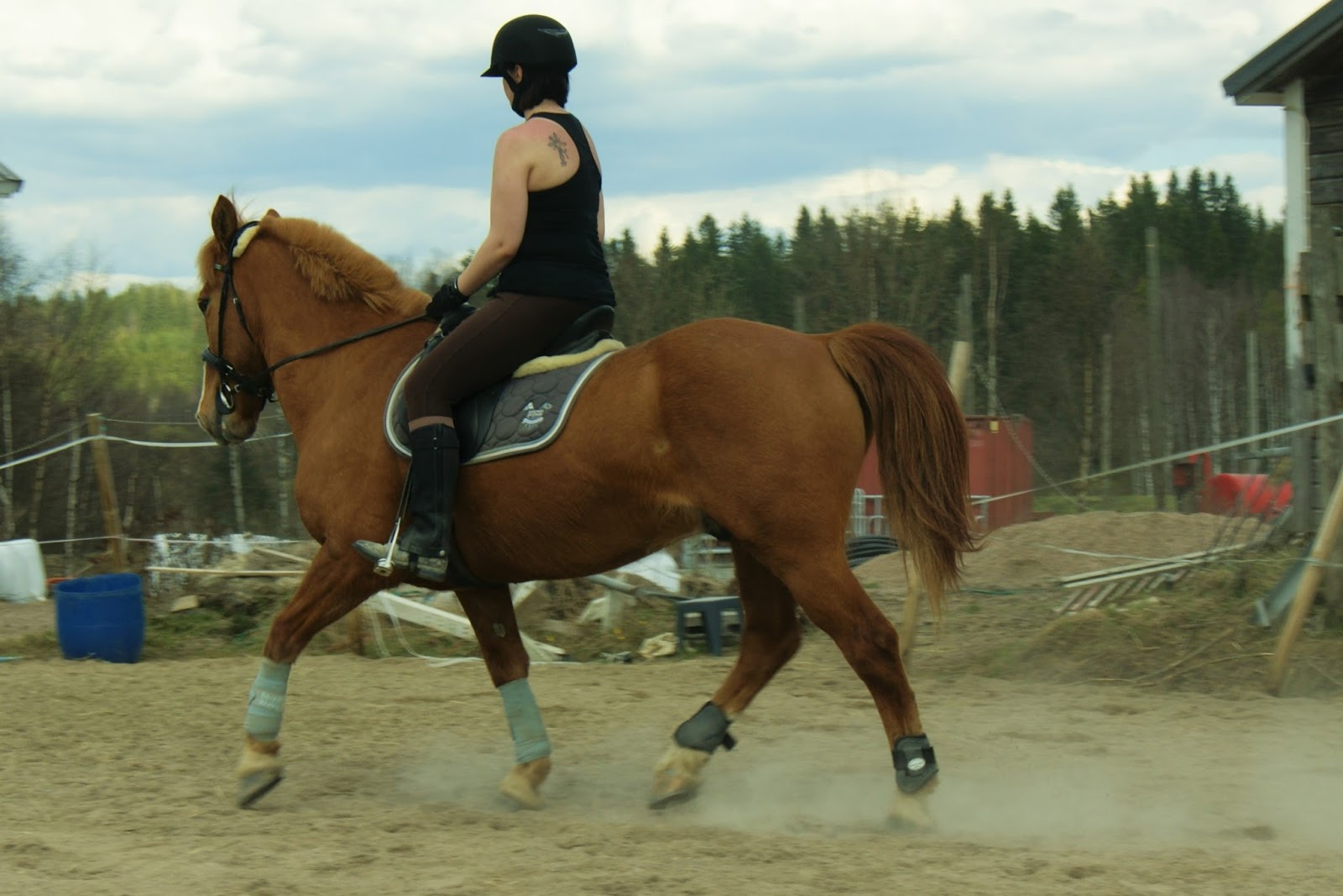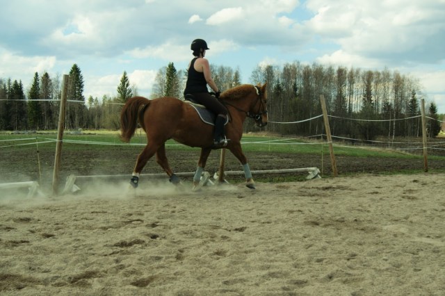 Laukoissa Ressu oli pitkä kuin nälkävuosi mutta laukka itsessään pyöri todella hyvin ja säädeltävyys oli ihan huippua verrattuna viime viikkoon treeneihin, joten annoin pitkänä olemisen anteeksi. Pääasia että oli edestä kevyt ja pyöritti laukkaa ilman tuuppaamista. Ravi muuttui tammojen laitumelle siirron jälkeen ihan uusiin sfääreihin, otettiin parit lisätytkin kun jätkä paineli niin makeilla askelilla oikein kunnolla työntäen takaa! Tähän oli hyvä lopettaa ja päästää jätkä akkojen kanssa laiduntamaan ensimmäistä kertaa tälle kesälle. 🙂