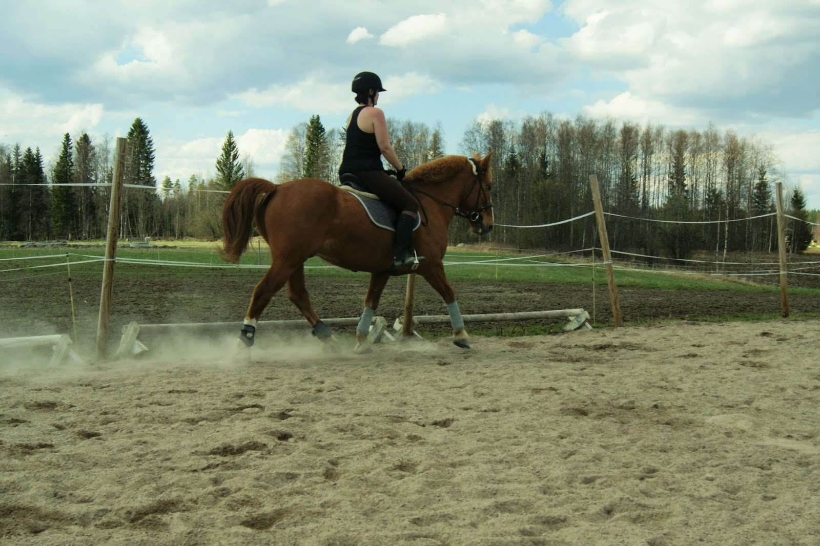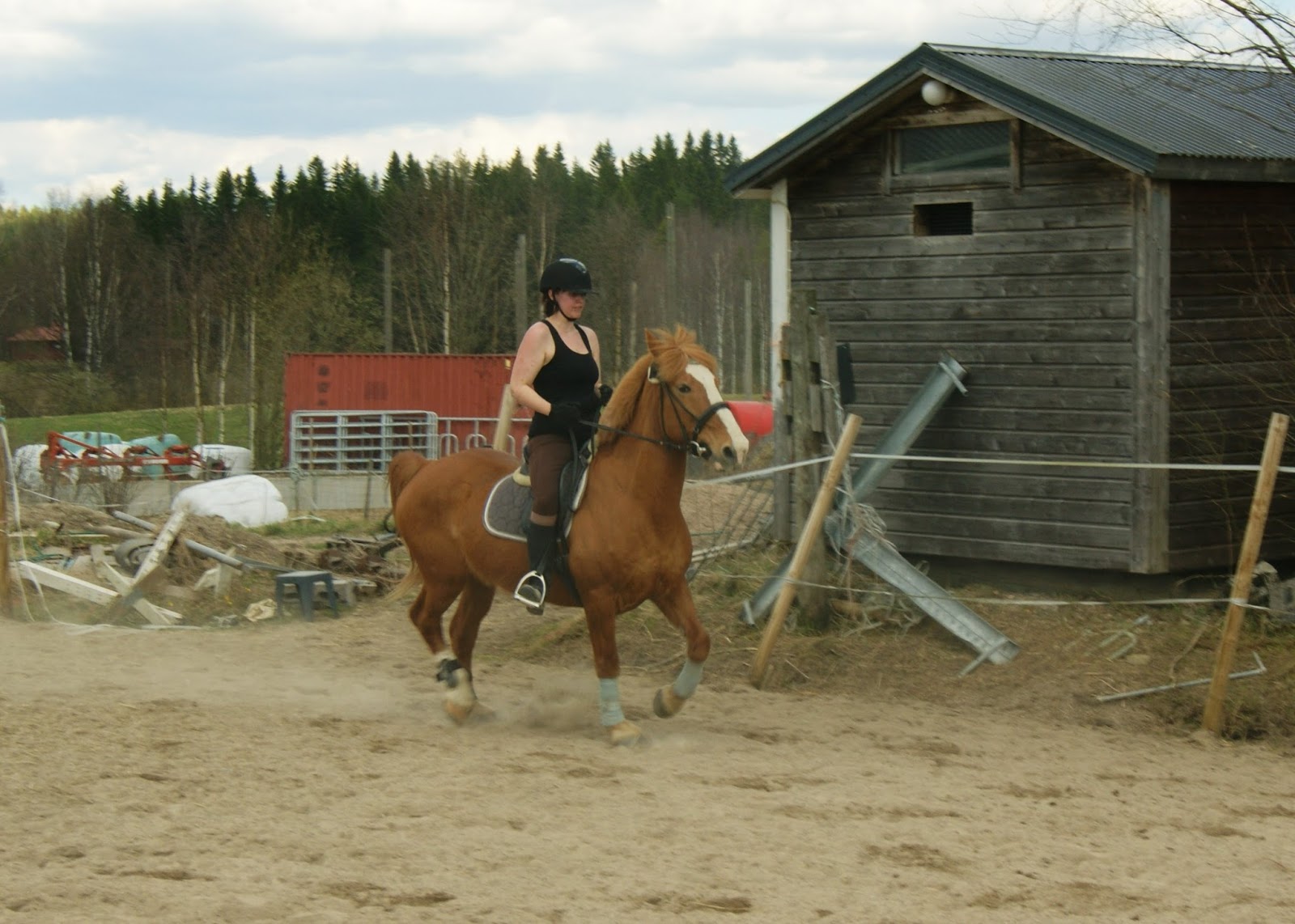 Olipahan päivä taas. Ensin aamu- ja päivätallit, siitä suoraan Ressun liikutukseen. Tallilla tuuli puuskissa välillä niinkin kovaa vastapalloon, ettei Ressu pystynyt kunnolla ravissa etenemään. Varustaessa mietin, ottaisinko hetkeksi liinan päähän mutta jätin liinan talliin ja lähdin kentälle. Hevoset oli siirretty takaisin talvitarhaan ja Ressuhan tietenkin tammojensa perään huusi ja kävi aivan ylikierroksilla koko ajan. Tuntui, ettei herra meinaa pöksyissään pysyä ja alkuverkka meni tappelun merkeissä. Oikea kylki oli kova kuin kivi eikä millään mennyt alkuun pohjeavut läpi ja Ressu kyttäsi aivan kaikkea mahdollista.