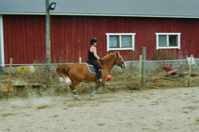 Tänään otin sitten laukkapainotteisen päivän, kun Ressu tuntui alusta saakka jotenkin äärettömän hyvältä vaikka vauhtia ravissa riitti, mutta oli silti tasainen ja kevyt edestä joten herran oma moottori on nähtävästi herännyt sunnuntailta kivasti. Perus jumppaa otettiin pohjalle kunnolla, jotta olisi kunnolla ohjan ja pohkeen välissä ja ennenkaikkea kevyt! Ressu herkästi alkaa painamaan kädelle, etenkin ensimmäisten laukkojen ajan ja kulkee niin kylki myyryssä ettei tosikaan, mutta tänään jo pelkästään nostot oli aivan mahtavia ja se säädettävyys oli huipussaan. Mulle vaikeaan kierrokseen (oikea) saatiin toimimaan kunnolla, tai sain itseni toimimaan kunnolla. Se tunne oli mahtava, kun pystyin rentoutumaan ja antamaan Ressulle mahdollisuuden suorittaa pyydetyt tehtävät rauhassa. Ressun omistajaa jopa nauratti hieman, kun herra oli aivan hikinen ja perskannikat vaahtosi kuin viimeistä päivää. Treeni tehosi, jospa nyt alkaisi syöttöporsaan ulkomuotokin pikkuhiljaa muuttumaan. 🙂