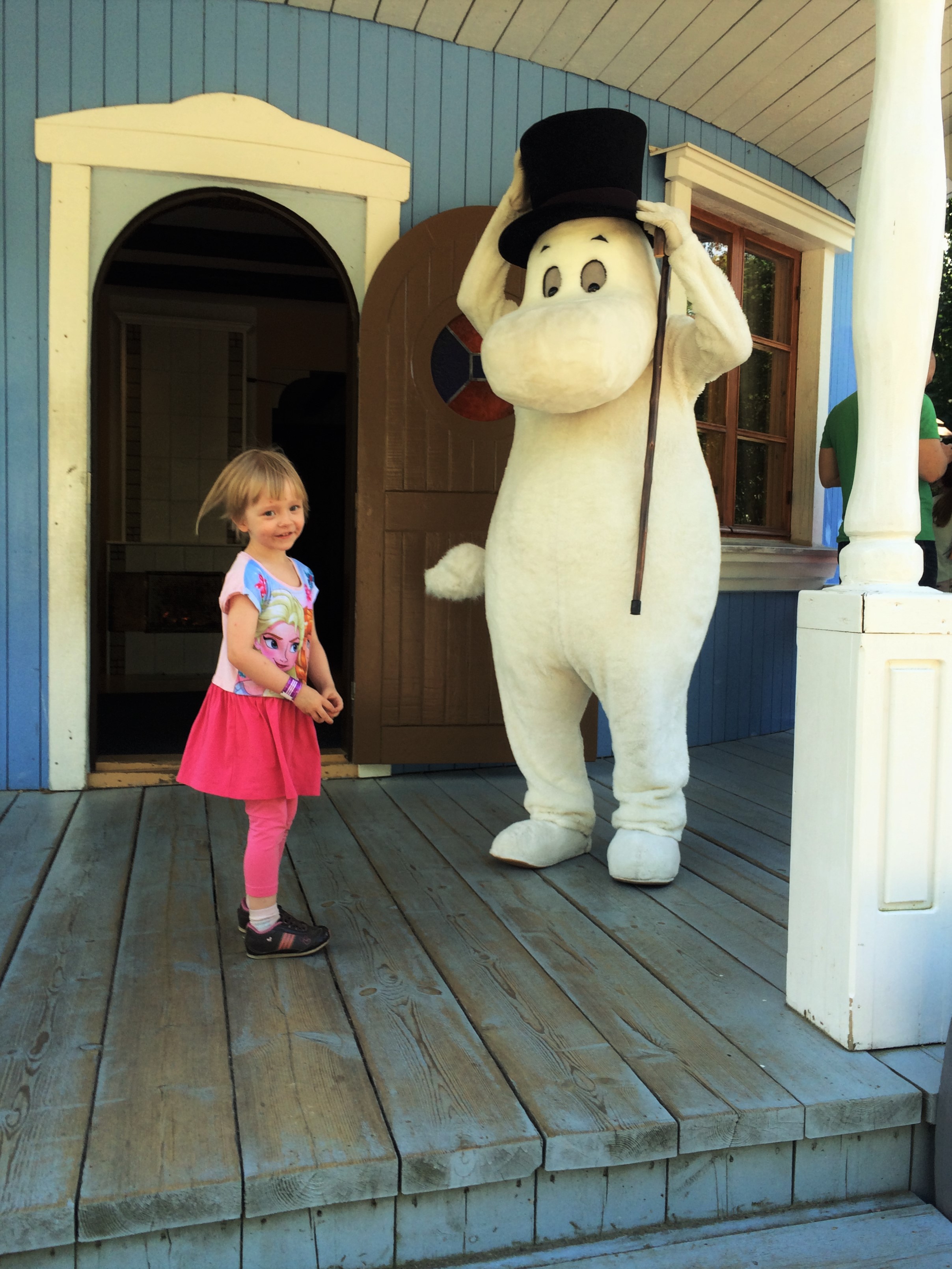 Lähdettiin kotoa keskiviikkoaamuna jo varhain, klo 7 oltiin pakkauduttu autoon ja ehditty käymään meidän lähikaupassa hakemassa matkaevästä. Onneksi tytöt on niin tottuneita reissaajia jo, ettei Laukaa-Lempäälä -pätkällä ollut juurikaan mitään rähisemistä kun molemmat nukkui. Mia heräsi puoli tuntia ennenkuin oltiin perillä Lempäälässä, jossa juotiin kahvit ja pääsin seurustelemaan aivan syötävän suloisen sylikummi-vaavin kanssa. Pari tuntia vietettiin aikaa ja puolilta päivin otettiin viimeinen ajorykäisy – kohti Turkua ja hotellia. Yövyttiin Sokos Hotel Hamburger Börsissä, josta napattiin Muumimaailman kahden päivän rannekkeet mukaan, heitettiin huoneeseen isoimmat matkatavarat ja otettiin mukaan Mialle ruoat ym tykötarpeet.