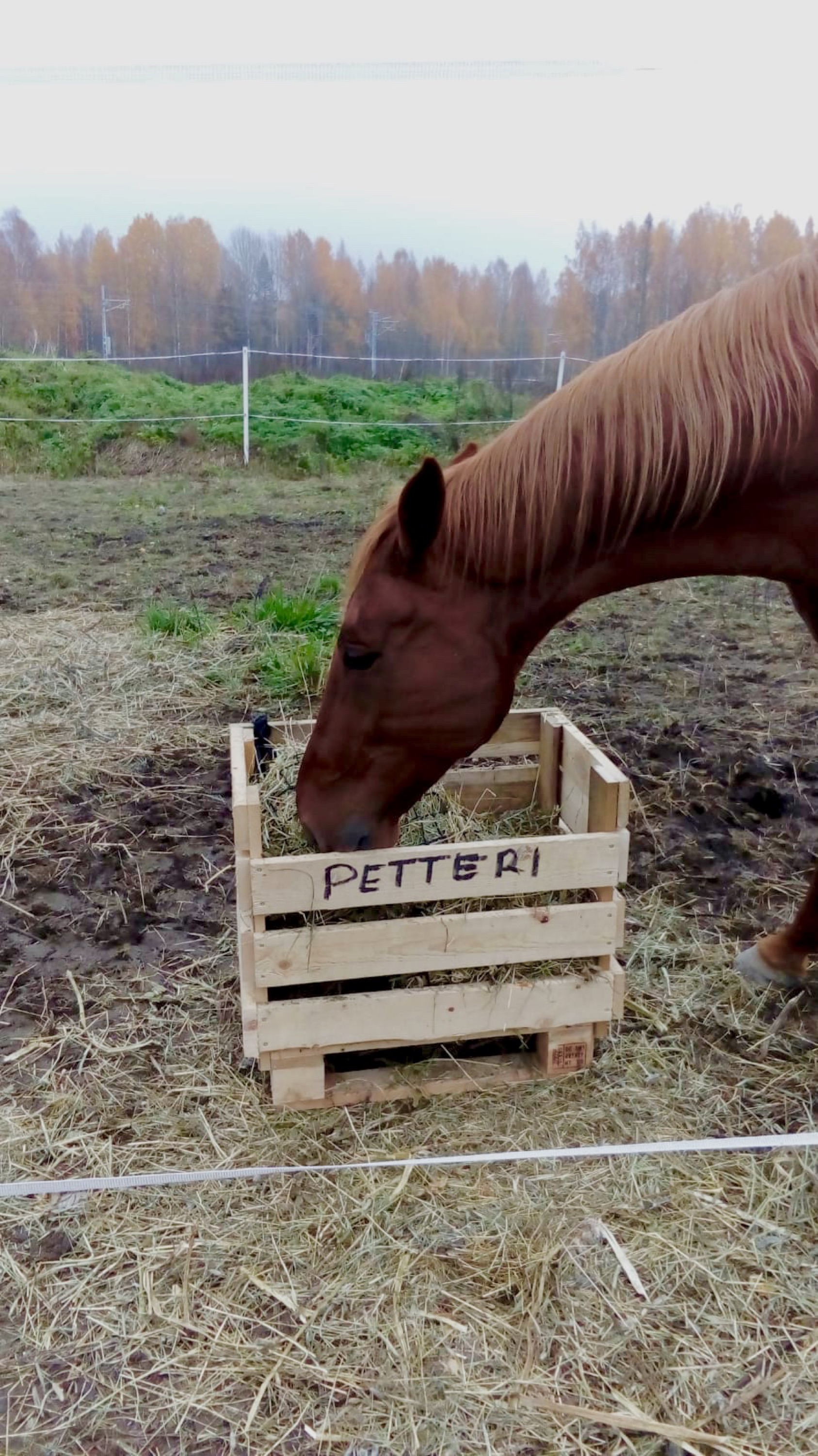 Reilu viikko sitten Petu tempasi jonkin kipukohtauksen päälle, heinä ja vesi maistunut ollenkaan eikä normaaleja aamutoimia tehnyt tarhaan päästyään vaan pyöri levottomasti, kuopi ja alkoi kaivamaan kuoppaa josta söi juuria. Olin jo aivan varma että nytkö ne mahaongelmat alkaa taas syystä X ja lähdettiin pellolle kävelemään ja suoli tyhjeni urakalla ja ilme piristyi. Laitoin sitten isälleni viestiä, että voisiko väsätä Petulle heinälaatikon ja illalla kävin hakemassa oikein nimikoidun laatikon johon aamulla virittelin heinäverkon jotta saisi hitaammin syötyä heinänsä. Illalla liikkui hyvin liikuttajan kanssa kun mulla oli vapaailta (ja silti olin tallilla :D) ja ei ollut kuin kuntoon laittaesa vähän näiveän näköinen.