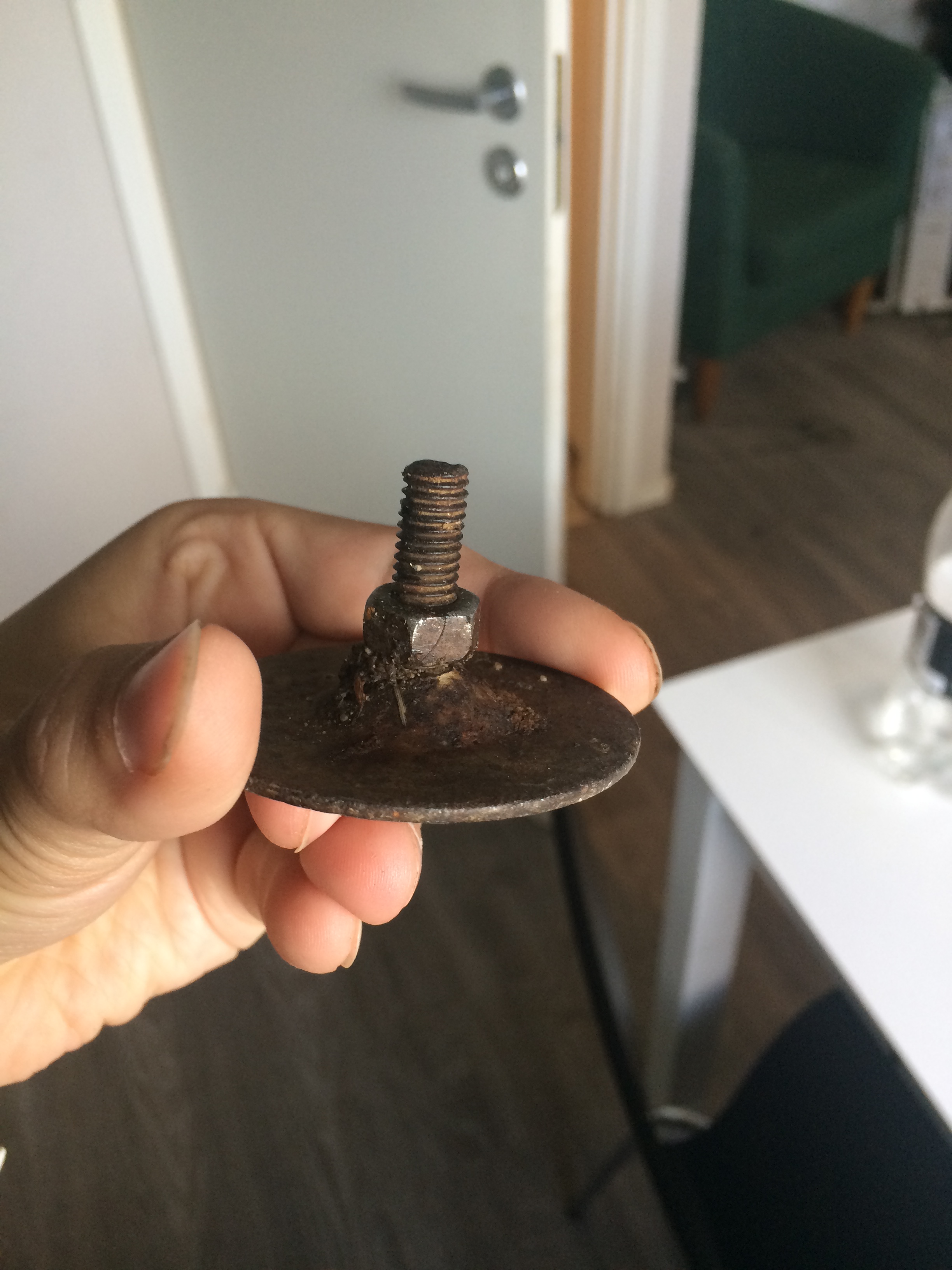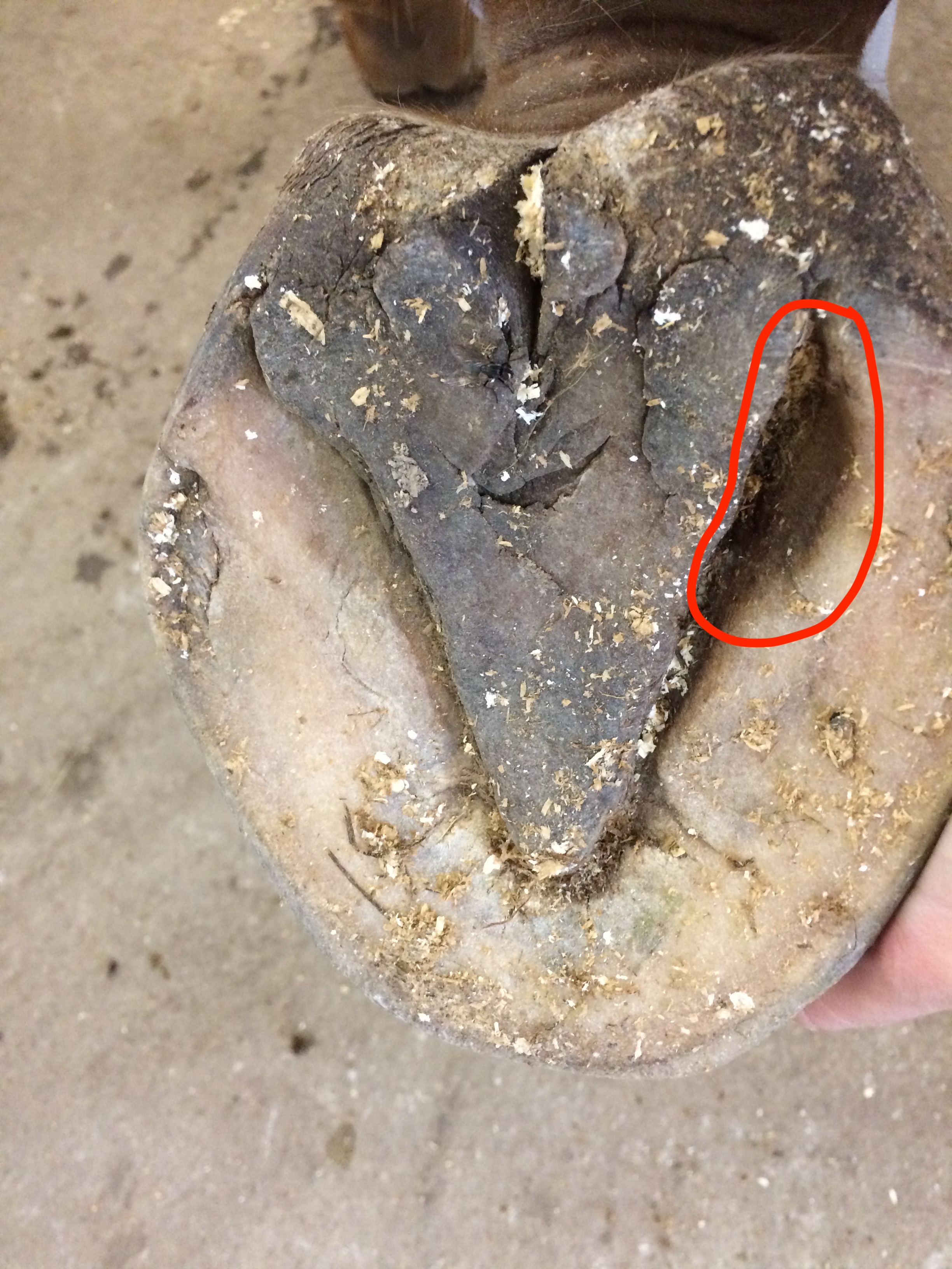 Mulla on aina tuntunut olevan äärettömän hyvä tuuri Petterin kanssa. Se on muutaman kerran kaatunut tarhassaan pahan näköisesti, kengän irtoamisen yhteydessä lähtenyt kerran iso pala kaviota mukana yms ja joka kerta olen saanut olla sydän syrjällään että mitä tulee vielä tapahtumaan, menikö jalka lopullisesti rikki, tuleeko kavioon jotain isompaa vaivaa. Joka kerta selvittiin säikähdyksellä, kuten myös mahahaavasta – nykyään lähes tulkoon oireeton, vaikka tilanne oli todella paha kaasuähkyineen päivineen silloin. Ollaan saatu olla aika rauhaksiin ilman sen kummempaa vahinkoa, kunnes perjantaina tapahtui jälleen. Petun vuokraajalla oli ratsastuspäivä ja oli ottamassa ukkoa sisälle, kunnes ihan ulko-ovien edessä astui jonkin esineen päälle ja tallissa muuttui täysin kolmijalkaiseksi. Vuokraaja huusi mut paikalle, kun höpöttelin ulkona tallikaverin kanssa. Ihmettelin kun Petu seisoi takajalka ylhäällä ja aina kun yritti varata painoa sille, nosti sen samantien ylös. Ihmettelin että mikä piru sillä nyt oikein on ja nopeasti katsoin että onpa iso kivi, kunnes tajusin ettei kengättömään kavioon oikein iso kivi juurikaan voi tarttua. Menin Petun viereen ja se nosti jalan mulle. Sieltä löytyi tämä..