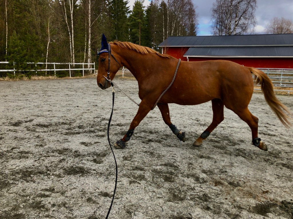 Mulle on jotenkin meidän alkuajoilta jäänyt tapa, että vapaiden jälkeen liikutaan maastakäsin. Vaikka ruuna on tasaantunut hyvin paljon ja on nykyään ihan ratsastettavissa vapaiden jälkeen, mutta jotenkin se on mukavampi ottaa maastakäsittelyyn. Saan käsityksen miten liikkuu, poni saa ilmaista riehumistarpeitaan herkemmin ilman, että ihmiset lentää kyydistä ja saa paremmin kuulolle. Tykkään nykyään enemmän ohjasajaa kuin suoraan juoksuttaa.