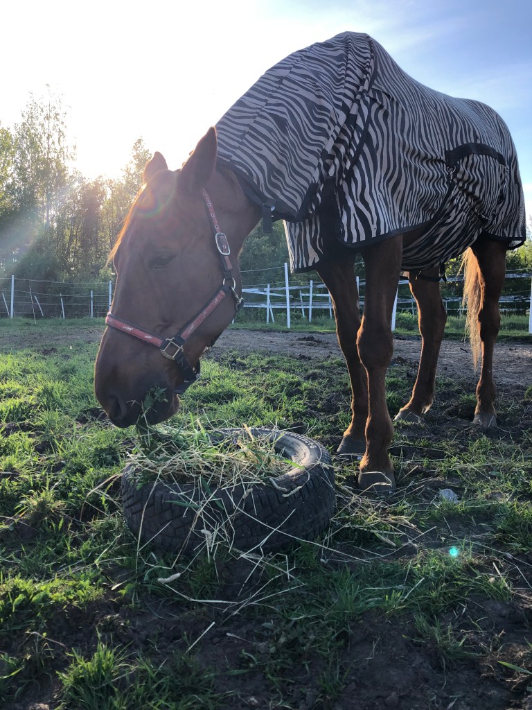 Nautiskeltiin kesäilloista vielä tarhatessa. Tallinpitäjän kanssa ryhdyttiin luoviksi kun Petu tykkää raahata heinäastiaansa joka paikkaan, ja kokeiltiin rengasta tarjoiluastiana. Tällä jätti heinäastian rauhaan, kun sai puuhata heinärenkaansa kanssa.