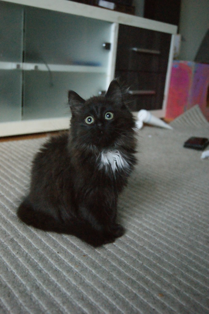 Pikkarainen, musta valkoisilla merkeillä oleva leikattu maatiaiskissa-narttu. Syntynyt 8.5.2021. Tuli meille lähes samoja reittejä mitä aikoinaan Vili tuli, kaveri suositteli meitä kun kokemusta oli ennestään populaatiokissoista ja niiden kotouttamisesta. Pikkarainen oli aliravittu ja hyvin huonossa kunnossa, 10 viikon ikäisenä painoi himpun yli 400g. Nykyään Pikkarainen on reipas iso tyttö jolla alkaa painoakin olla päälle 2 kiloa. Viihtyy hyvin paljon tyttöjen seurassa ja nukkuu useimmiten olohuoneen oven päällä.